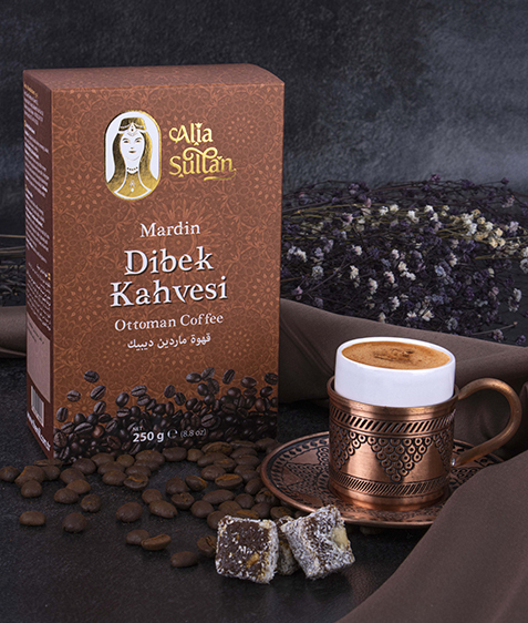 Dibek Kahvesi, kavrulmuş kahve çekirdeklerinin dibek taşında dövülmesi ve yumuşak tadlı çeşitli baharatların karıştırılması ile oluşur.
